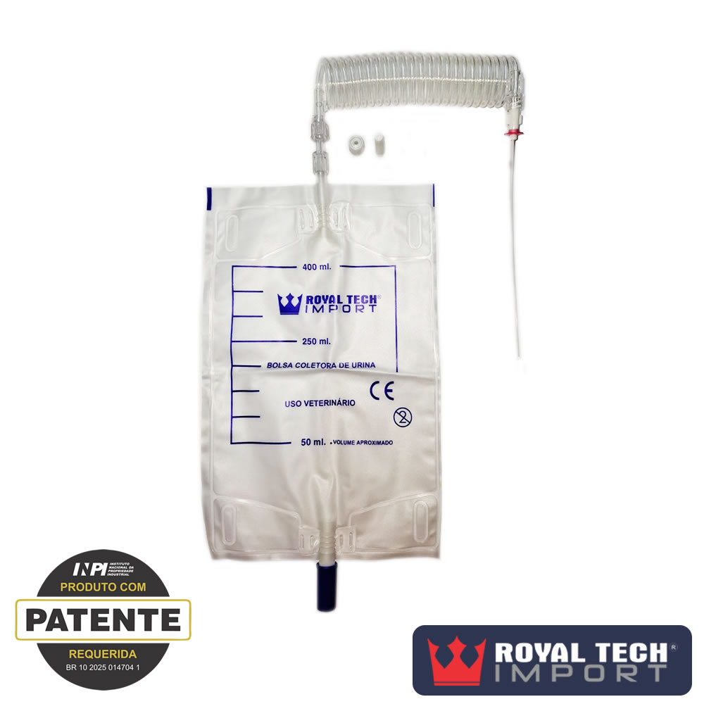 A Bolsa estéril coletora de urina com sistema fechado veterinária da Royal Tech Import é confeccionada em PVC e Policarbonato de alta qualidade, possui capacidade para armazenar 400ml de urina. Desenvolvida para conectar em sondas uretrais que possuem sistema luer lock, seu extensor é espiral e flexível, com comprimento de 1.8 metros para maior mobilidade e conforto do paciente. Para facilitar o monitoramento do fluxo urinário, a bolsa possui marcações de 50, 250 e 400ml. Para maior segurança possui duas válvulas, uma anti-refluxo e outra de esvaziamento.