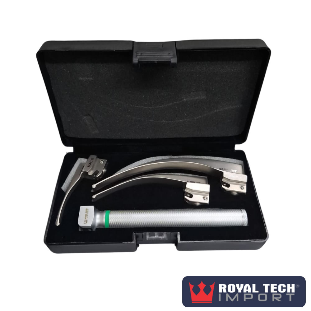 O Kit de Laringoscópio Reutilizável veterinário fibra óptica da Royal Tech Import é confeccionado com componentes de alta qualidade para proporcionar um procedimento preciso de laringoscopia e intubação endotraqueal e maior durabilidade do equipamento. O conjunto é constituído por um cabo antiderrapante em metal com alimentação em Led 2.5V tamanho P, 3 lâminas do modelo fibra óptica curvas (Macintosh) em aço inoxidável nos tamanhos N. 0, N.2 e N.4, além de um estojo revestido com espuma e tecido para proteger o equipamento. O acabamento das peças e acetinado (fosco) para evitar brilho e reflexão, proporcionando maior conforto visual. A tecnologia das lâminas em fibra óptica Hi-light com 4.3mm de diâmetro e 6.500 fios de fibras individuais, combinada com uma lâmpada Led de 2.5v do cabo, eleva a iluminação em até 40% comparada com as lâmpadas halógenas convencionais. O sistema diminui a possibilidade de mal contato comparado com os laringoscópios convencionais. Lâminas compatíveis com cabos que possuem conformidade com o ISO 7376 (padrão verde). Produto esterilizável e autoclavável, possui vida útil estimada pelo fabricante de 5 anos.